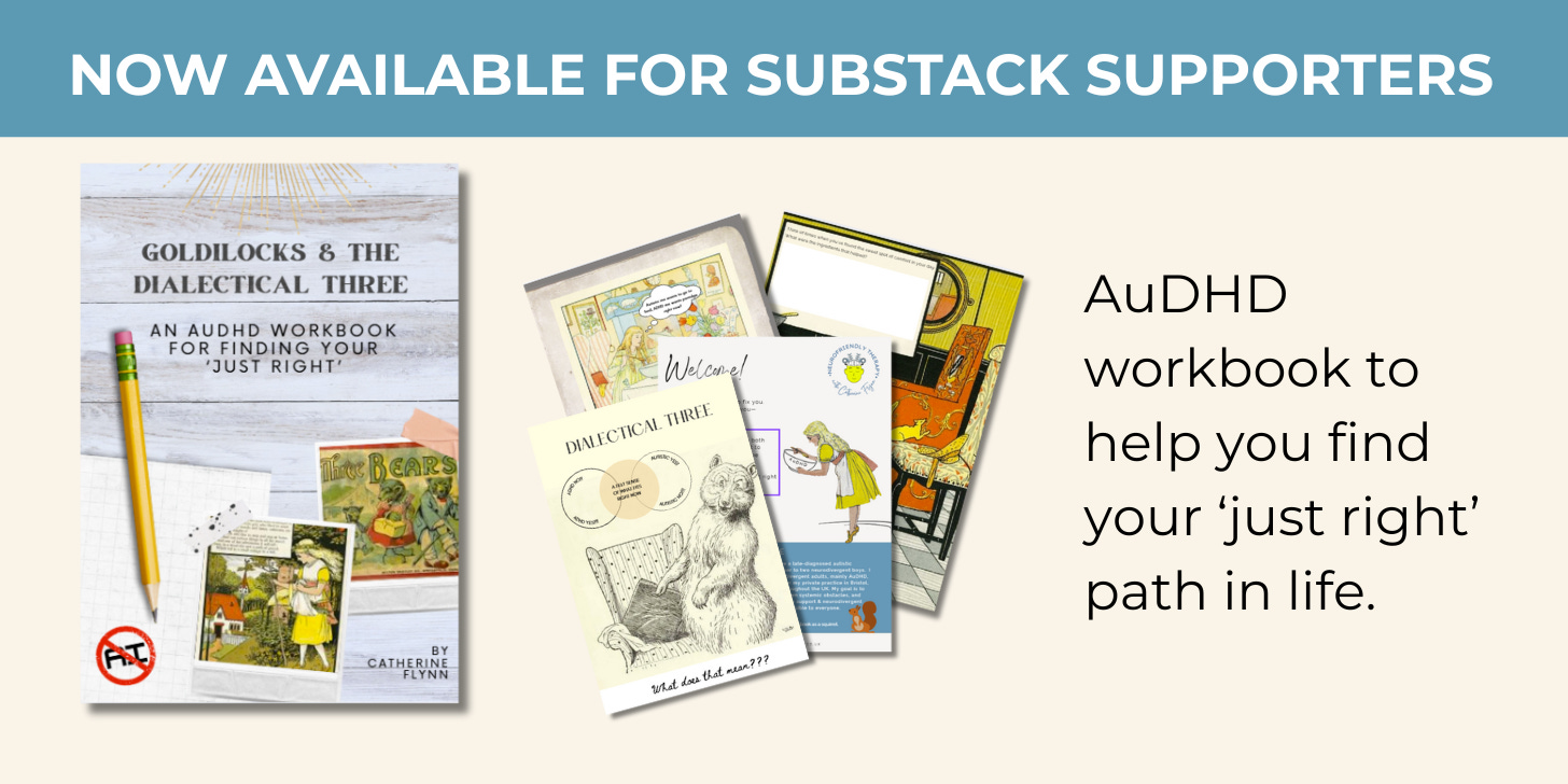 AuDHD WorkbookAre you struggling with creating a life that works for being AuDHD?Neurofriendly TherapyNov 09, 2025∙ Paid11ShareThank you for being a Substack supporter. The AuDHD Workbook is inspired by the story of Goldilocks & The Three Bears. It’s designed to inspire you with ideas and journal prompts to guide you towards your ‘just right’.Download your copy below.👇Continue reading this post for free, courtesy of Neurofriendly Therapy.Claim my free postOr purchase a paid subscription.PreviousNext